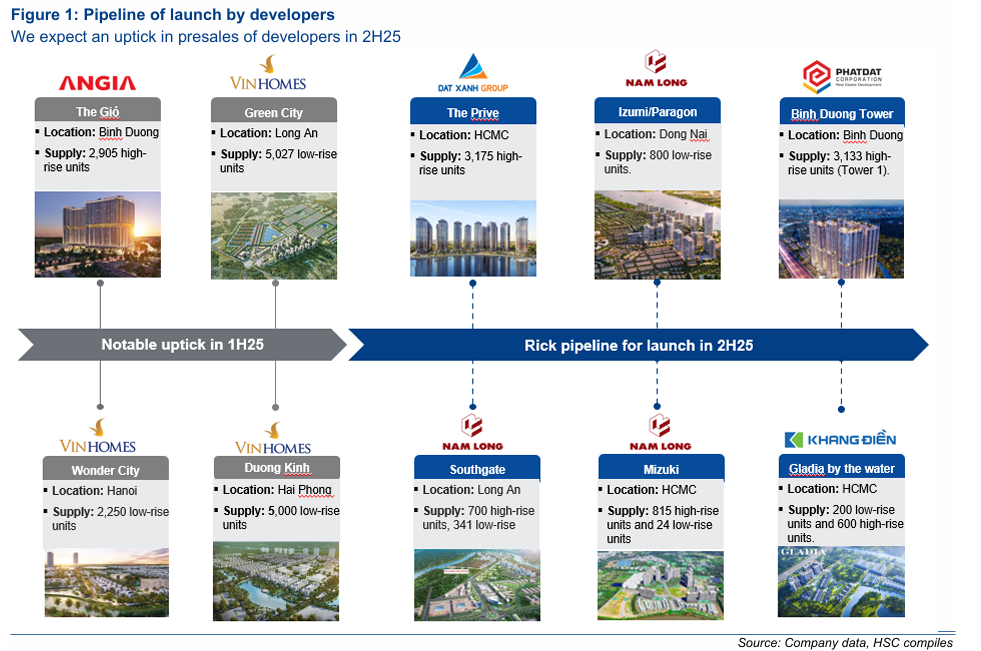 Trong giai đoạn 1H25 lượng mở bán chủ yếu đến từ VHM và dự kiến sẽ được đẩy mạnh trong 2H25 với kỳ vọng tỷ lệ hấp thụ tích cực hơn, các dự án mở bán trước trong cuối năm chủ yếu đến từ phía nam.