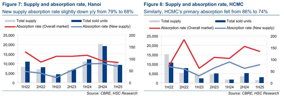 Tỷ lệ hấp thụ đạt 74% ở HCMC và 68% ở Hà Nội; nếu tính cả hàng tồn, HCMC đạt 137%, Hà Nội 85%. Trong ngắn hạn, các chủ đầu tư có sẵn hàng bán tại HCMC như NLG, DXG, KDH sẽ hưởng lợi.