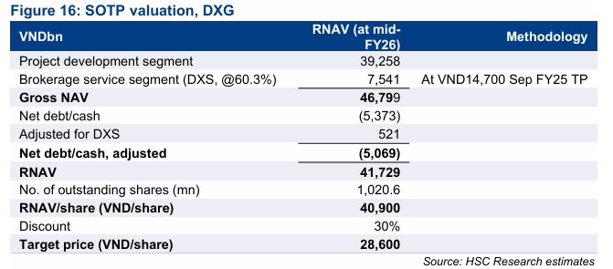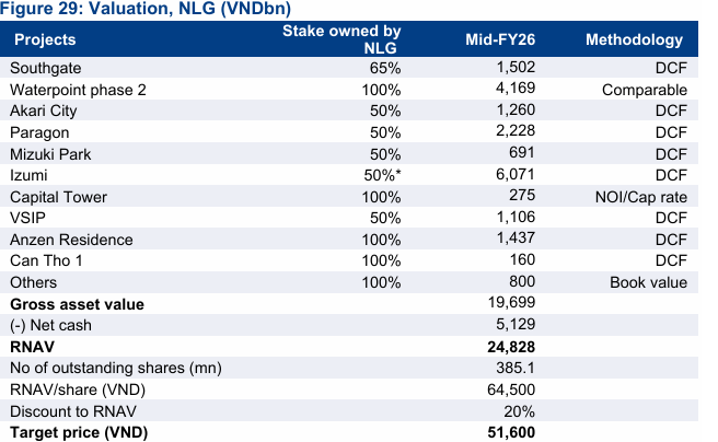 Từ những phân tích trên, HSC nâng dự phóng cho NLG với tiềm năng tăng giá hơn 20%, đặt giá mục tiêu 51.600 VND/cp, được định giá theo phương pháp SOTP, phản ánh triển vọng tăng trưởng lợi nhuận và tiến độ bàn giao dự án tích cực trong giai đoạn tới.