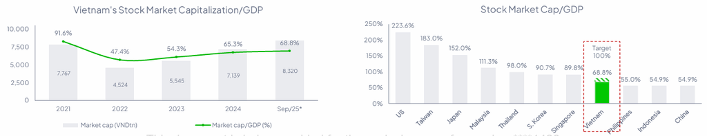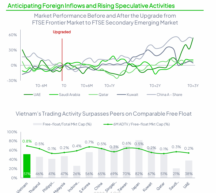 Các kinh nghiệm từ việc nâng hạng thị trường mới nổi (EM) trước đây như Qatar và UAE cho thấy chênh lệch lãi suất trái phiếu doanh nghiệp đã giảm 20–30 điểm cơ bản, đồng thời chi phí phát hành cổ phiếu tiếp theo cũng giảm khi dòng vốn nước ngoài tăng mạnh. Thị trường vốn sâu hơn và giá trị vốn hóa cao hơn khuyến khích các công ty niêm yết hoặc huy động vốn, với tỷ lệ vốn hóa thị trường hiện đạt khoảng 70% GDP (~352 tỷ USD, tháng 8/2025), một đợt nâng hạng bền vững có thể nâng tỷ lệ này gần bằng các nước trong khu vực (>100%).