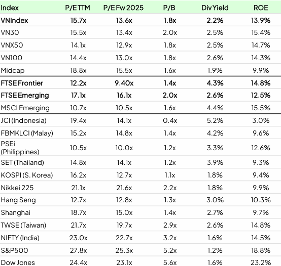 Thị trường Frontier (cận biên) thường giao dịch với P/E thấp hơn so với Emerging. Khi nâng hạng → khoảng cách định giá được thu hẹp.