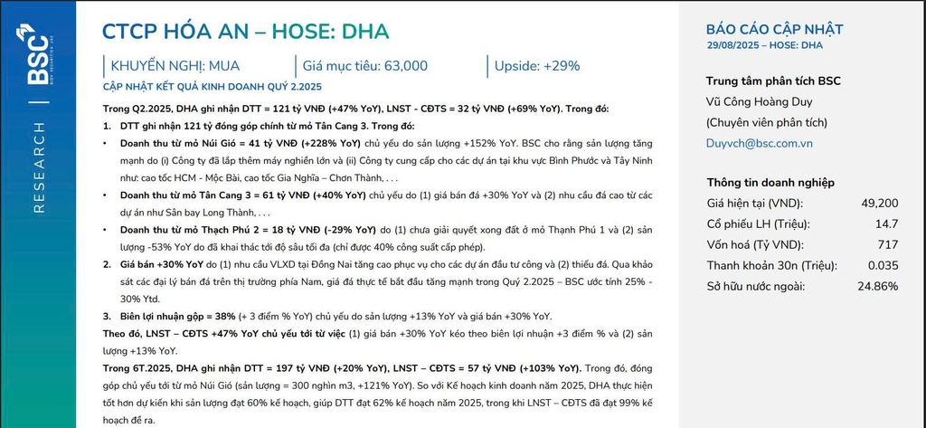 Đáng chú ý, tháng 5/2025, DHA được phê duyệt mua lại 100% CTCP Khai thác và Sản xuất Xây dựng Ánh Dương, sở hữu mỏ Tây Kà Rôm 1 (Ninh Thuận). Đây là động lực tăng trưởng doanh thu mới trong giai đoạn tới.