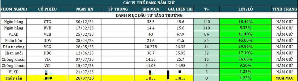 Tính đến thời điểm hiện tại, GRIT đang nắm giữ tổng cộng 10 vị thế cổ phiếu, được phân bổ theo từng quý đầu tư. Trong quý 1, GRIT khuyến nghị các mã CTG, BVB và VLB. Sang quý 2 là DDV, VCG và DBC. Gần đây nhất, trong quý 3, GRIT vừa bổ sung thêm bốn cổ phiếu: VIX, VCI và hai mã mới XX1, XX2 – đều đang nằm trong danh mục theo dõi chặt chẽ.