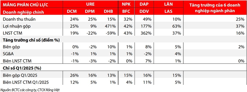 Nhìn vào minh họa có thể thấy tổng doanh thu của 6 doanh nghiệp ngành phân bón trong Q1.2025 ghi nhận sự tăng trưởng 25% YoY. Tuy nhiên, mảng phân Ure và Lân tăng trưởng ít hơn mảng phân NPK và DAP do sự tăng trưởng phân DAP đến từ yếu tố giá và sản lượng trong khi các mảng khác chủ yếu là tăng trưởng sản lượng.