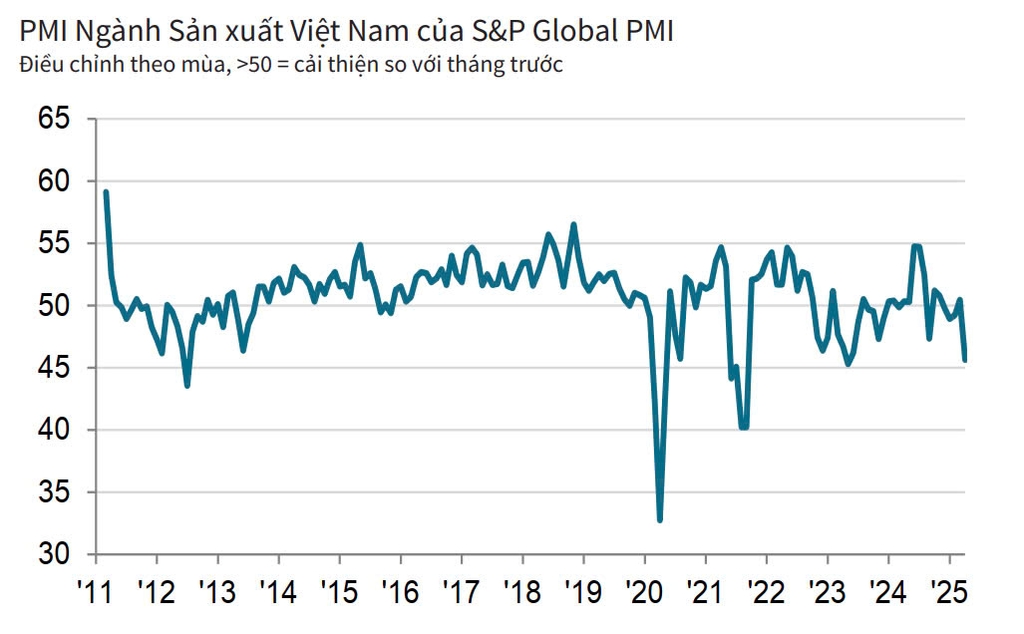 Theo báo cáo mới nhất của S&P Global, những thông báo về thuế quan của Mỹ đã khiến ngành sản xuất của Việt Nam suy giảm trong tháng 4. Sản lượng, số lượng đơn đặt hàng mới, việc làm và hoạt động mua hàng đều giảm mạnh. Cụ thể, PMI tháng 4 của Việt Nam chỉ đạt 45,6 điểm so với mức 50,5 điểm của tháng trước. Bối cảnh kinh tế thế giới bất định cũng tác động không nhỏ đến niềm tin kinh doanh của các nhà sản xuất trong tương lai. Theo đánh giá của S&P Global, niềm tin kinh doanh đã giảm mạnh xuống mức thấp nhất kể từ tháng 8/2021.