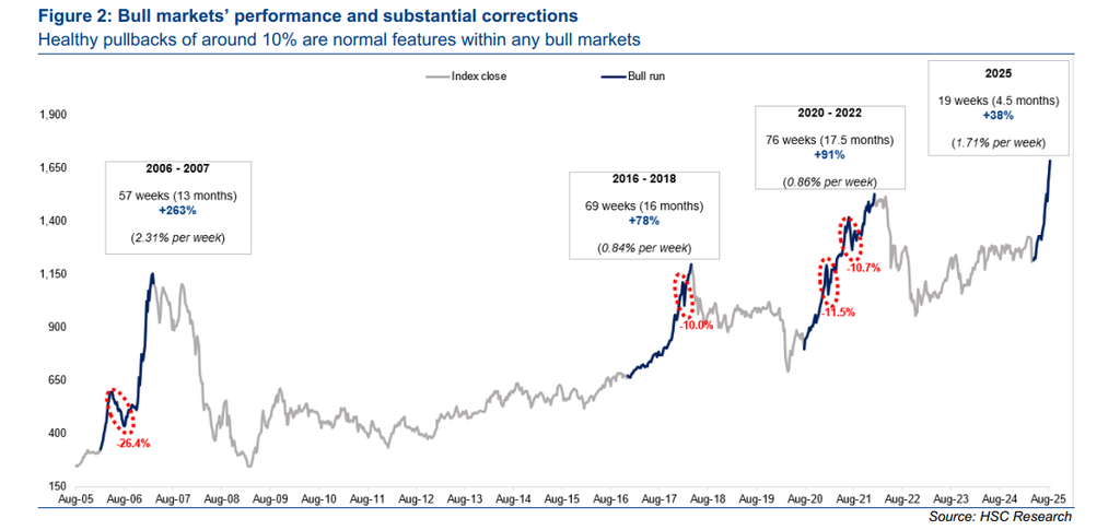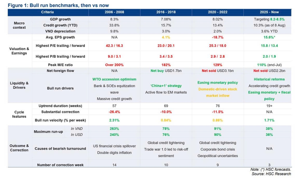 So với các chu kỳ 2006–08 hay 2020–22, lần này thị trường đi lên từ nền tảng lợi nhuận doanh nghiệp thực chất, chứ không phải chỉ do dòng tiền đầu cơ. Đây chính là yếu tố khiến sóng tăng hiện tại có khả năng bền vững nhất trong 20 năm qua.