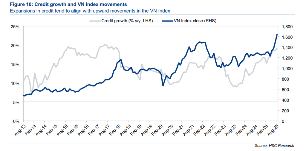 - Tăng trưởng tín dụng 10.3% YTD, có thể hướng đến 20% để đáp ứng mục tiêu GDP. Lịch sử cho thấy tín dụng và TTCK luôn đồng pha.